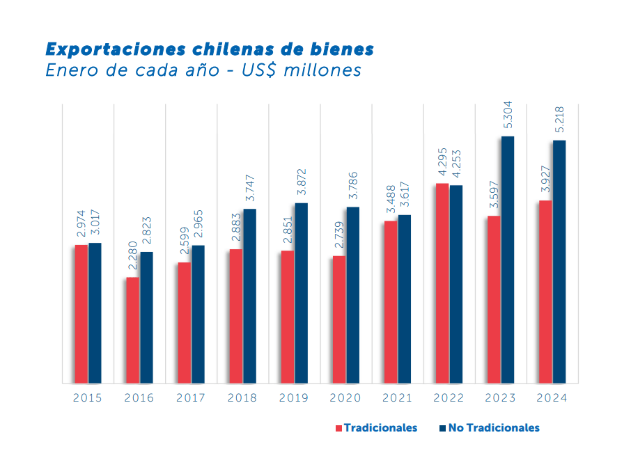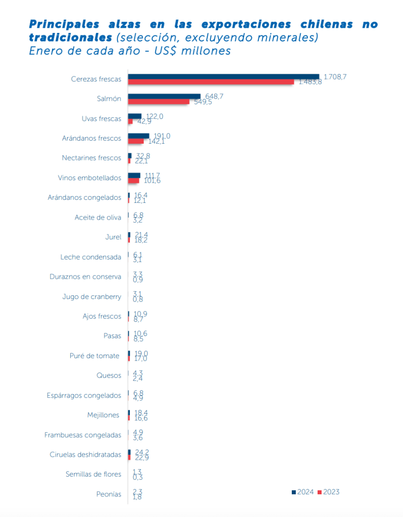 En enero de 2024, Chile exportó un total de 2.645 productos no tradicionales diferentes,