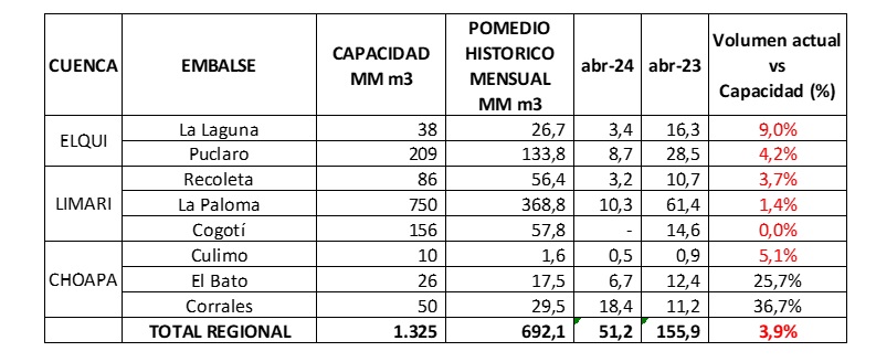 Los embalses están en niveles de déficit alarmantes, especialmente en la provincia de Limarí, donde todos sus embalses están por debajo del 5% de su capacidad máxima. Por otra parte, si bien los embalses de la provincia de Choapa, al menos 2 de 3, se ven con su capacidad por sobre el 25 %, son embalses mucho más pequeños que los embalses de Elqui y Limarí. El caso de Elqui no es distinto con su embalse más grande Puclaro, con un 4,2% de su capacidad disponible.