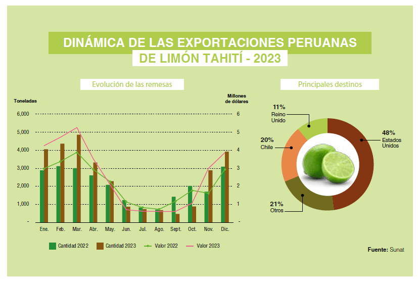 De acuerdo a Fresh Fruit Perú, los rendimientos por hectáreas no fueron los mejores debido a las condiciones climáticas. La elevada temperatura limitó bastante el crecimiento del producto. Sin embargo, muchos nuevos cultivos iniciaron nueva producción, lo cual permitió que el año cerrara positivamente. Con ello, en el 2023 los envíos de limón Tahití cerraron en 29,365 toneladas por un valor de US$ 30 millones. Esto significó un crecimiento del 19% en volumen y 18% en valor. Con respecto al precio, este fue en extremo volátil, pero promedió muy similar al año anterior con US$ 1.03 por kilogramo.