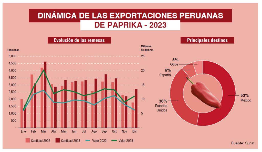 La ventana comercial de la paprika suele abarcar todo el año debido a las presentaciones que permiten largos almacenajes y una una mejor planificación de envíos. Gracias a ello, en el 2023 las remesas sumaron 37,756 toneladas por un valor de US$ 149 millones. Esto significó un crecimiento de 6% volumen y 33% en valor.