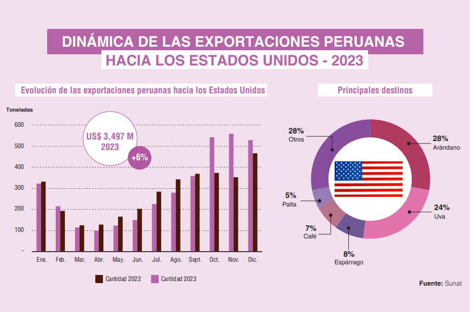 El 2023 no fue la excepción y los Estados Unidos volvió a liderar con US$ 3,497 millones importados de productos agrícolas peruanos, 6% mayor a lo obtenido en el 2022. El crecimiento no ha sido igual en todos los productos debido a que la limitada oferta mundial, hizo que muchos productos fueran redireccionados a mejores postores.