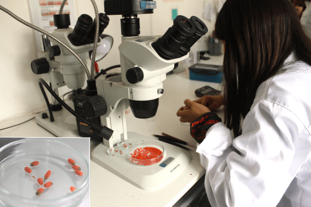 Luego, las pupas son envasadas en bolsas plásticas, las irradian y son embaladas en cajas de plumavit, con elementos refrigerantes que regulan o mantiene una temperatura baja necesaria para retardar su proceso de maduración.
