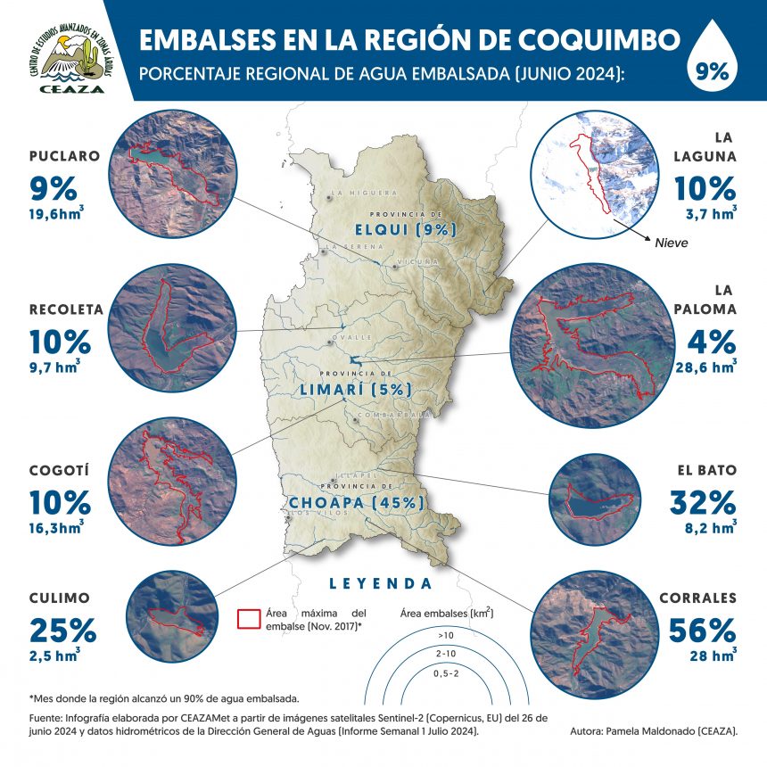 En consecuencia, el agua embalsada en la provincia del Elqui es de un 9% con respecto a su capacidad, en Limarí de un 5% y en Choapa de un 45%, señala este boletín climático. Por ende, existe una mayor reserva de agua embalsada en Choapa y menor en Limarí.