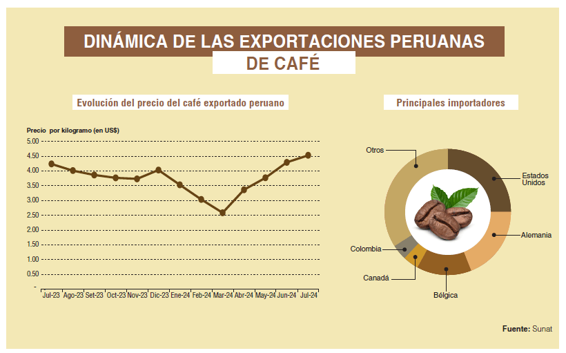 El Perú, luego de una campaña complicada y de exportaciones no muy sobresalientes, este año ha mostrado resiliencia. Y en buen momento. Hasta julio del 2024, los envíos han sumado 108,752 toneladas por un valor cercano a los US$ 417 millones. Esto significó un crecimiento de 125% en volumen y 93% en valor. Los precios obtenidos arrancaron bajos en los primeros meses del año por la excelente campaña de rivales de la región como Colombia o Brasil. Sin embargo, la situación ha ido cambiando gradualmente, con precios en picos históricos durante los últimos meses. El promedio hasta julio se ubicó en US$ 3.84 por kilogramo, 14% menor que el año anterior por los resultados bajos del primer trimestre. Sin embargo, para este último mes se encuentra por encima de US$ 4.53 por kilogramo y no parece que vaya a ceder. Para beneplácito de los agricultores peruanos, este pico en el precio se da en uno de los meses más altos de exportación para la campaña peruana.