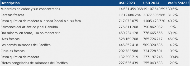 Según la subsecretaria de Relaciones Económicas Internacionales (SUBREI), Claudia Sanhueza.“El sector exportador sigue manteniendo un importante dinamismo, en un contexto desafiante a nivel global. La industria minera continúa liderando los envíos, aunque vemos un importante crecimiento en sectores relevantes para el país como frutas frescas, alimentos orgánicos, maquinarías, celulosa y servicios, lo que permite continuar con los esfuerzos de diversificación de nuestra canasta exportadora”