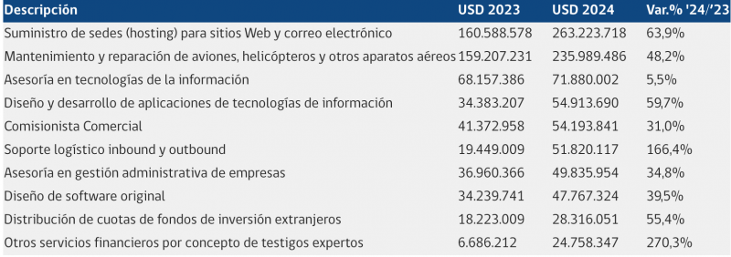 En el caso de los servicios, el dinamismo en los envíos al exterior ha sido liderado por las prestaciones de hosting para sitios web y correos electrónicos (Cloud Centers), que permanece como el más exportado en lo que va de corrido del año, con retornos por US$ 263 millones (+64%). Le siguen mantenimiento y reparación de aeronaves (+48%), soporte logístico inbound y outbound (+166%), diseño y desarrollo de aplicaciones TICs (+59,7%) y diseño de software original (+39,5%).