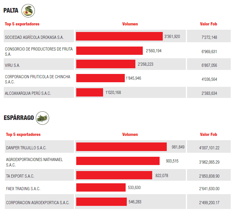 Cerrando el top 5, se ubicó el espárrago, con 11,398 toneladas enviadas por un valor de US$ 47 millones. Esto significó una caída del 5% en volumen, pero con un crecimiento del 2% en valor. El precio pudo compensar la reducción del volumen al aumentar en promedio un 7%, quedando en US$ 4.13 por kilogramo.