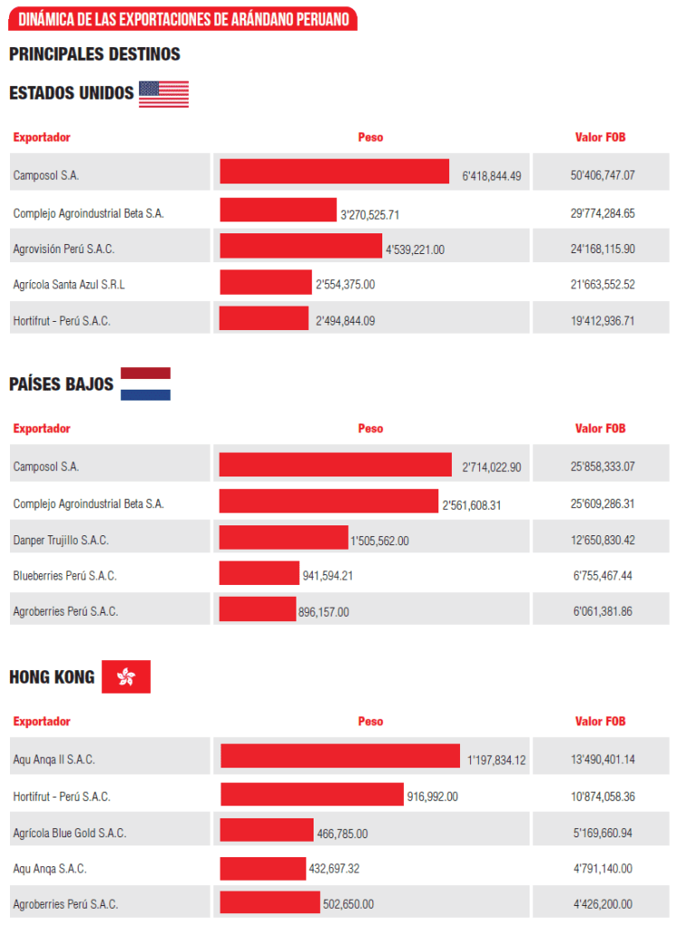 El arándano peruano ha representado uno de los impulsos más grandes para la canasta agroexportadora desde su ingreso masivo hace poco más de una década en los cultivos peruanos. Desde entonces, el Perú se posicionó como el mayor exportador de arándanos frescos en el mundo, reemplazando a competidores directos como Chile, que tenían mucho más tiempo en el mercado.