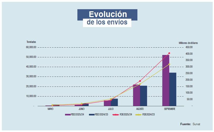 Con temperaturas más estables en el 2024, la actual campaña ha sido de recuperación. Los cultivos han presentado ritmos de crecimiento más normalizados a lo largo de todas las regiones del país y durante el avance de las semanas de la campaña ha ido con mayor estabilidad. La campaña de arándano inicia en mayo y finaliza en abril del año siguiente, y en lo que va de la temporada 2024/2025 hasta el cierre de septiembre los envíos totalizaron cerca de 82,200 toneladas por un valor de US$ 661 millones. Esto significó un crecimiento de 23% en volumen y 16% en valor.