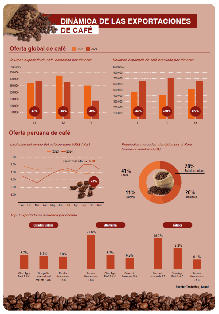 Hasta el cierre de noviembre, en el acumulado anual, las exportaciones peruanas lograron aprovechar parcialmente las oportunidades generadas tras la incertidumbre de la producción de café en Vietnam y Brasil, producto de las condiciones climáticas adversas. Este panorama incrementó la demanda de café sudamericano, mejorando los precios y beneficiando a las exportaciones peruanas. Sin embargo, la producción local no pudo satisfacer completamente el aumento de la demanda generado por estos acontecimientos.