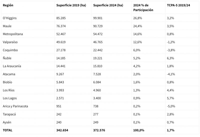 Fuente: Catastro Frutícola Odepa Ciren. Año 2024: para O’Higgins, Atacama y Coquimbo; 2023 para Valparaíso y Metropolitana; y 2022 para Arica y Parinacota, Tarapacá, Maule, Ñuble, Biobío, La Araucanía, Los Ríos, Los Lagos y Aysén.
