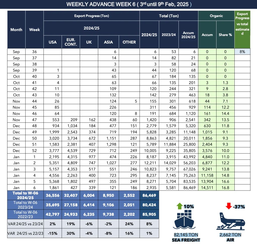 El volumen estacional acumulado hasta la semana 6-2025 alcanza las 86.469 toneladas, lo que evidencia un aumento de 8%