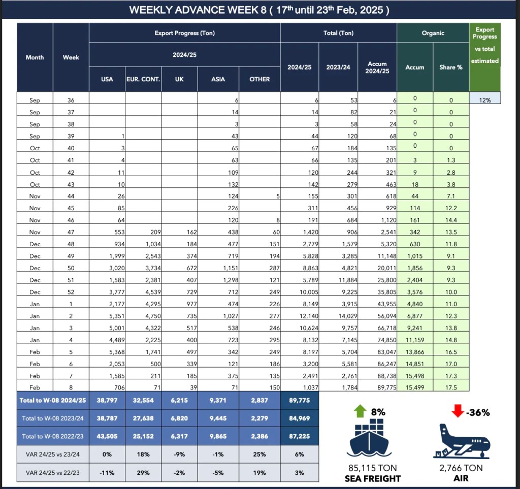 Los embarques han mostrado un aumento de 12% en comparación con la estimación inicial de volumen para la temporada (80.176 toneladas a la semana 8).