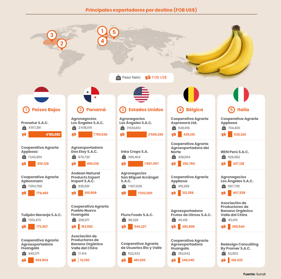 En el primer trimestre del 2025, las exportaciones peruanas de banano cayeron un 12% en volumen y un 9% en valor, afectadas por problemas hídricos y por la amenaza de aranceles en Estados Unidos, lo que podría afectar su desempeño anual.