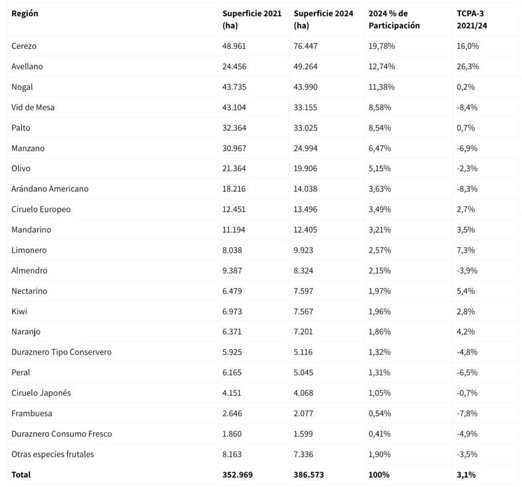 Donde destacan 10 especies con un crecimiento positivo en la superficie plantada los últimos 3 años y 10 cuya superficie desciende. Tanto porcentualmente como en el cambio de superficie acumulada, la especie que más crece es el cerezo con un crecimiento de 27.487 hectáreas en los últimos 3 años y una tasa de crecimiento promedio anual (TCPA-3) de 16% para el mismo período, le sigue el avellano con una superficie acumulada de crecimiento de 24.808 hectáreas y una TCPA-3 de 26,3%.