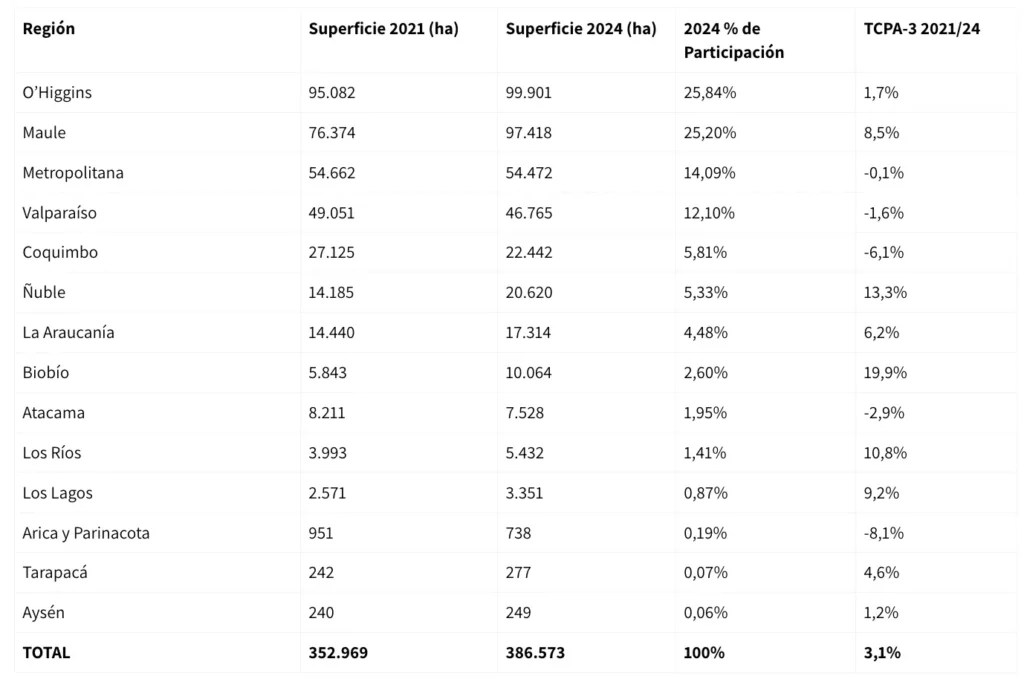 Fuente: Catastro Frutícola Odepa Ciren. Año 2024: para Atacama, Coquimbo O’Higgins, Maule, Ñuble, Biobío, La Araucanía, Los Ríos y Los Lagos; 2023 para Valparaíso y Metropolitana; y 2022 para Arica y Parinacota, Tarapacá y Aysén.