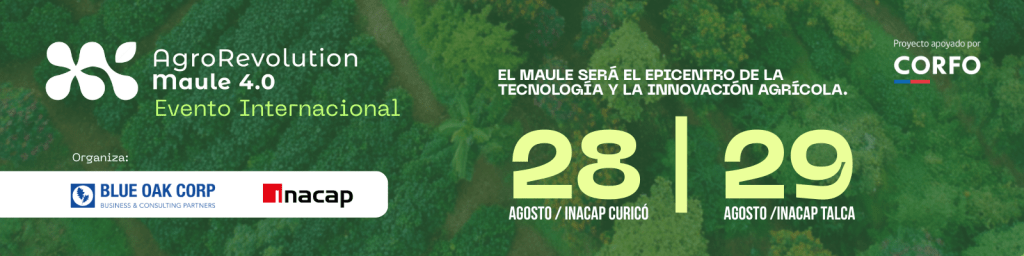Talca, agosto 2025.- La región del Maule será la capital de la tecnología y la innovación agrícola este 28 y 29 de agosto cuando se realice Agrorevolution Maule 4.0, evento organizado por Blue Oak Corp, gracias al apoyo del instrumento Viraliza de Corfo Maule. El encuentro se desarrollará en dos jornadas, la primera en Inacap Curicó, y la segunda en Inacap Talca. Quedan pocos días para quienes se quieran registrar para asistir a una o ambas jornadas y así actualizarse con las últimas novedades de la industria.