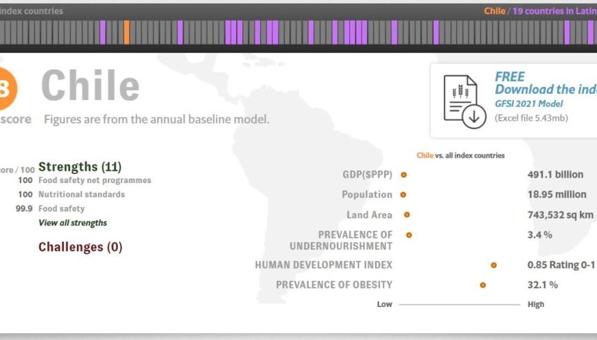 En el ranking de seguridad alimentaria de Global Food Security Index, realizado por The Economist, Chile obtuvo el 28° lugar a nivel mundial y el primer lugar en Sudamérica, reafirmando la gran labor que cumple la cadena agroalimentaria en nuestro país, su reconocimiento global y sus fortalezas. El ranking evalúa a todos los países del mundo de acuerdo a asequibilidad, disponibilidad, calidad y seguridad de … Continúa leyendo Chile se posiciona como líder en Sudamérica en ranking de seguridad alimentaria
