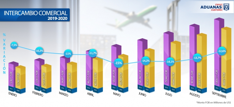 De acuerdo al Reporte de Comercio Exterior elaborado el Servicio Nacional de Aduanas. Entre enero y septiembre de 2020 la Recaudación Tributaria fue de 8.768 millones de dólares Para el período enero a septiembre del 2020 las cifras de comercio exterior presentaron un mejor desempeño respecto a los acumulados de meses anteriores, con un intercambio comercial de Chile con el mundo que alcanzó un total … Continúa leyendo En septiembre Chile aumentó 1,9% sus exportaciones con US$ 4.997 millones en envíos