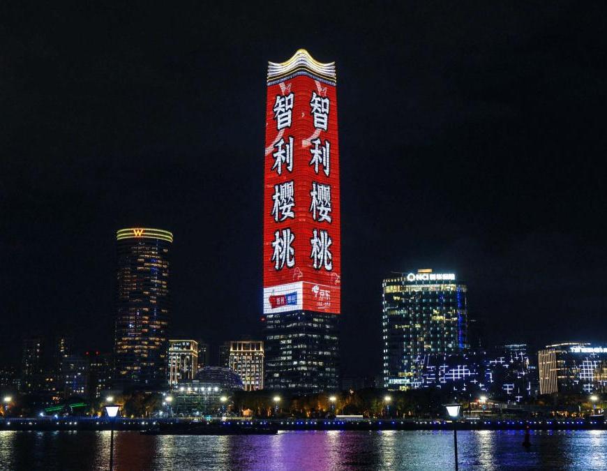 En principal rascacielos de Shanghái se anuncia la llegada del primer cargamento marítimo de cerezas chilenas de la temporada